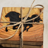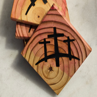 To make each piece truly special, we use a hot branding iron to brand Three Crosses on every coaster. Coasters measure 4 x 4 by a 1/2" thick